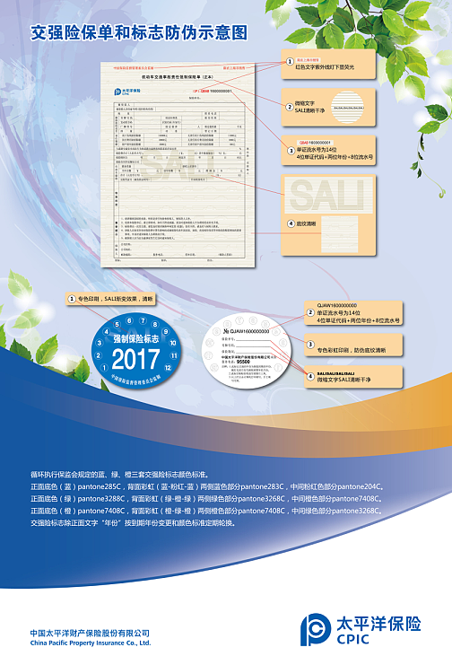 一看,識別單證真?zhèn)?。要仔細辨別單證是否具有監(jiān)管要求的防偽技術(shù)。一是,交強險單證正本左上角“中國保險監(jiān)督管理委員會監(jiān)制”、右上角“限在×××銷售”字樣,并應(yīng)使用紅色熒光防偽油墨,在紫外燈下發(fā)紅色;二是,交強險單證標題下有一條以“SALI”為內(nèi)容的微縮文字形成的橫線,與標題等長,在5-10倍以上放大鏡下清楚可辨;三是,交強險單證滿版由轎車和貨車圖案做浮雕底紋,中間可見光柵效果的“SALI”四個字母。