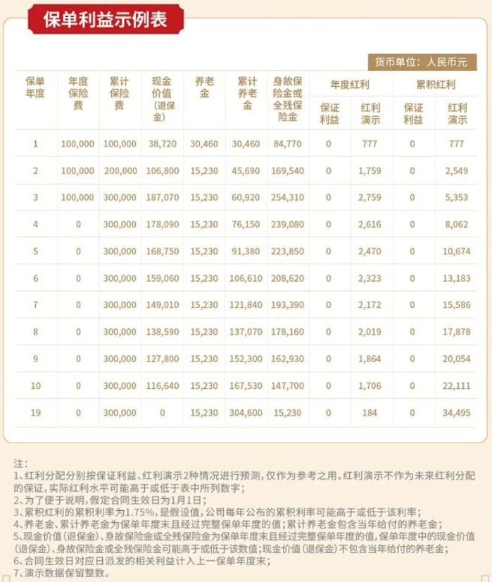 注:1.保險(xiǎn)期間屆滿時(shí)不再給付養(yǎng)老金。2.在任何情況下,身故保險(xiǎn)金和全殘保險(xiǎn)金不可兼得,即若本公司給付任何一項(xiàng)保險(xiǎn)金,另一項(xiàng)保險(xiǎn)金不再給付。