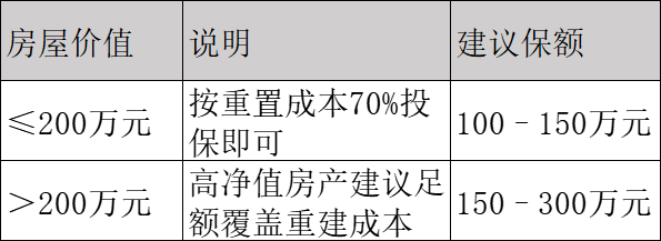 房屋主體保額按市場(chǎng)估值設(shè)定,通常為房產(chǎn)總價(jià)的60%-80%,新房可按購房?jī)r(jià)投保;