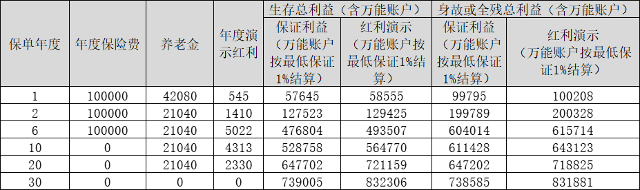 王女士,60周歲,為自己投保了10份“太保鴻壽年年金保險(分紅型)”(簡稱“鴻壽年年”),年交保費(fèi)100000元,6年交,養(yǎng)老金領(lǐng)取期間選擇30年,保險期間為至養(yǎng)老金領(lǐng)取起始日起第三十個合同生效日對應(yīng)日前一日24時止,基本保險金額21040元,養(yǎng)老金領(lǐng)取方式選擇年領(lǐng),紅利領(lǐng)取方式為累積生息。