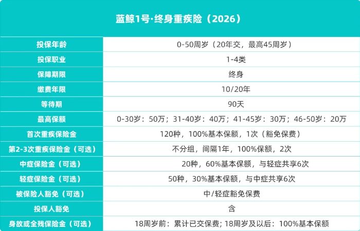 海豚君家的新品——藍鯨1號·終身重疾險(2026),可以按需靈活定制,各項保障責任也很給力!