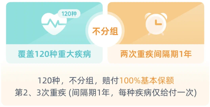 但藍鯨1號除了120種重疾的首次保障,還能選擇重疾二、三次賠,疾病不分組,間隔期僅1年。