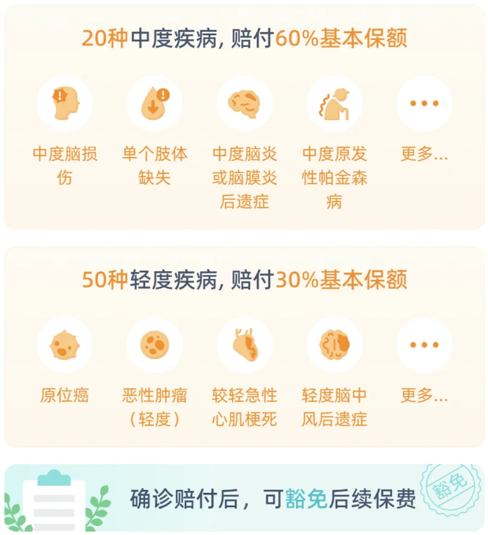50種輕癥賠30%保額,20種中癥可賠60%保額,而且一旦確診后續(xù)保費全部豁免,保障繼續(xù)有效,這個設(shè)計太人性化了!