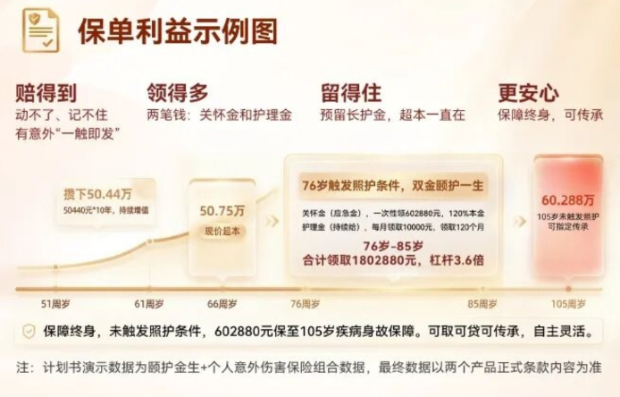保障終身,61周歲后(含),未觸發(fā)照護條件,602880元保至105歲疾病身故保障。